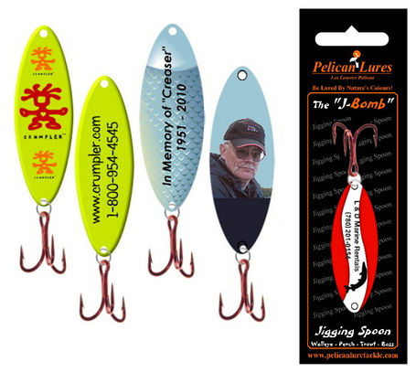 Powder coated metal jigging spoon with premium treble hook. Imprinted on both sides in 4cp and packaged in Pelican Lures card and blister. Great lures for jigging with a salted minnow attached to the hook. Try them out ice fishing this winter!